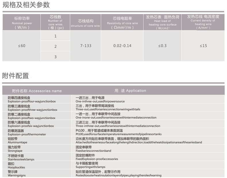 簡介: 高值PTC串聯式電熱帶是一種利用導電芯線為發熱元件的伴熱電纜,用于石油、化工等行業長輸管道防凍、防凝、保溫和熱補償,串聯式電熱帶的單根設計長度可在100~5000米內任意選擇。技術參數: ◆ 額定電壓:≤660V 50Hz/60Hz; ◆ 長度范圍:100~5000米/根; ◆ 功率范圍:≤60W/m; ◆ 介電強度:工作電壓220V為1500V/min,工作電壓為380V為1800V/min,工作電壓為660V為2500V/min; ◆ 防爆等級:ExeⅡT4; ◆ 耐溫等級:125℃、180℃、205℃、260℃; ◆ 導電芯線材質:PTC合金、鎳基合金、康銅、鍍銀銅絞線、鍍鎳銅絞線、鍍錫銅絞線; ◆ 芯線數:單芯、雙芯或三芯; ◆ 發熱芯線電阻率范圍:0.02~0.14Ω.mm/m范圍內任意選擇; ◆ 絕緣材料:F46、PFA、阻燃硅橡膠。特點: ◆ 針對某一管道工作參數專門設計,可靠性高; ◆ 結構科學合理,使用壽命較其它電伴熱帶長; ◆ 適合于管線長度較長且電源點少的伴熱管道; ◆ 適用于環境惡劣的有腐蝕性的場所。典型應用: 各種固定管線、管網的伴熱、石油石化、化工、電力、化纖、港口碼頭、油田等長輸管線或大型罐體的伴熱。產品外形與結構